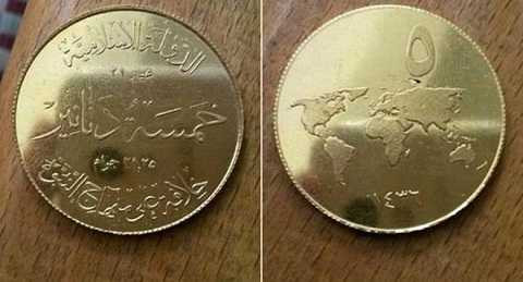 Đồng vàng này được thiết kế khá ổn, bao gồm hình bản đồ thế giới, mặt kia là dòng chữ Arab có nghĩa: "Nhà nước Hồi giáo - Nhà nước Calip dựa trên học thuyết của Đấng Tiên tri".