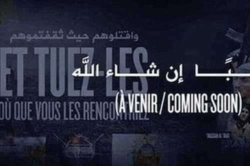 Tiêu đề trên tấm poster được dịch ra cả tiếng Pháp và tiếng Ả rập cùng với dòng chữ “sắp diễn ra” ở góc bên phải được nhà phân tích nhận định nhiều khả năng còn ám chỉ những vụ tấn công tiếp theo trong tương lai không xa.