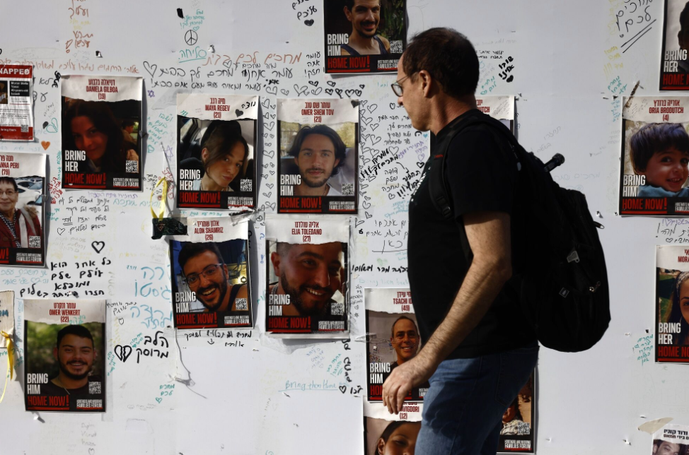 Hình ảnh các con tin Israel bị Hamas bắt giữ trên bức tường gần Bảo tàng Nghệ thuật Tel Aviv vào ngày 22/11/2023. (Ảnh: Bloomberg)