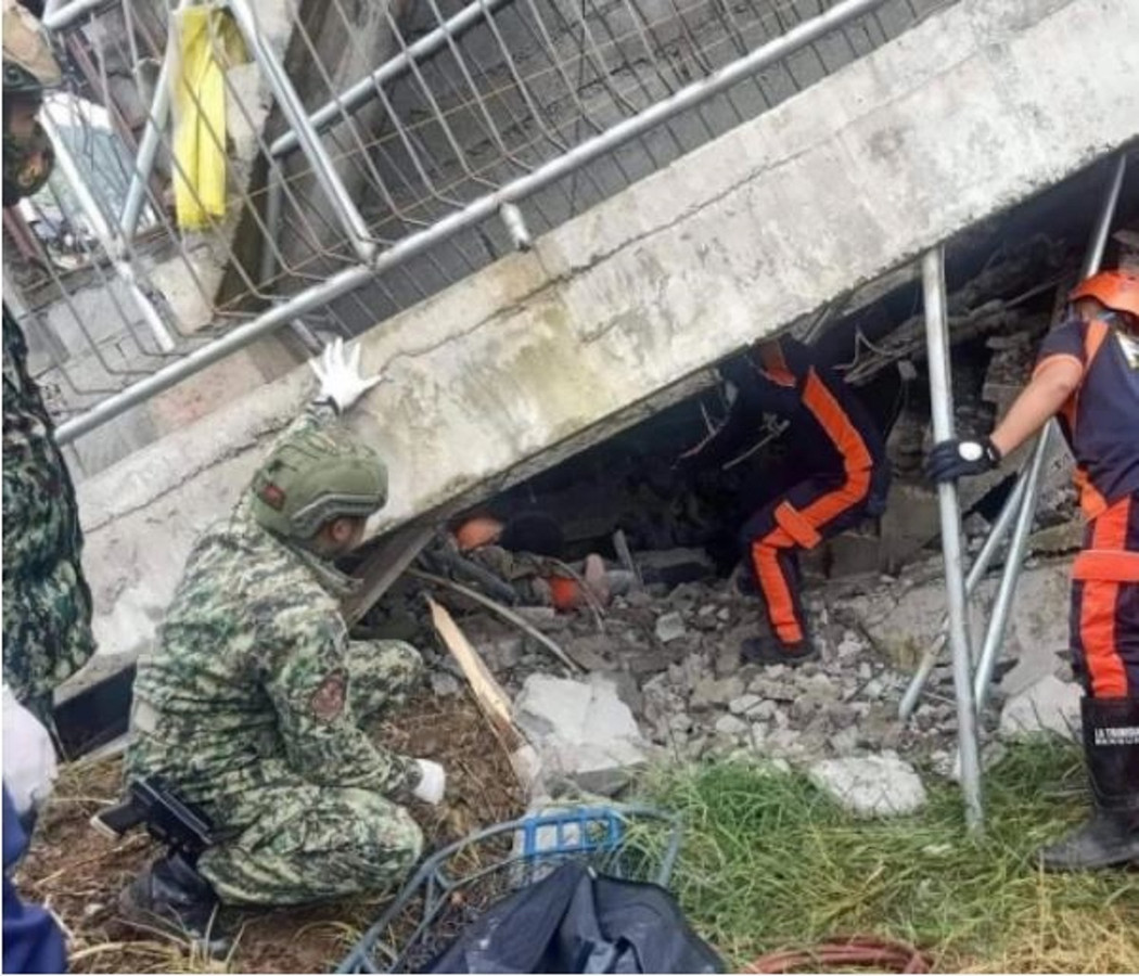 Cảnh sát và nhân viên cứu hộ tìm cách giải cứu người bị mắc kẹt trong tòa nhà bị sập do động đất ở La Trinidad, Philippines. (Ảnh: EPA-EFE)