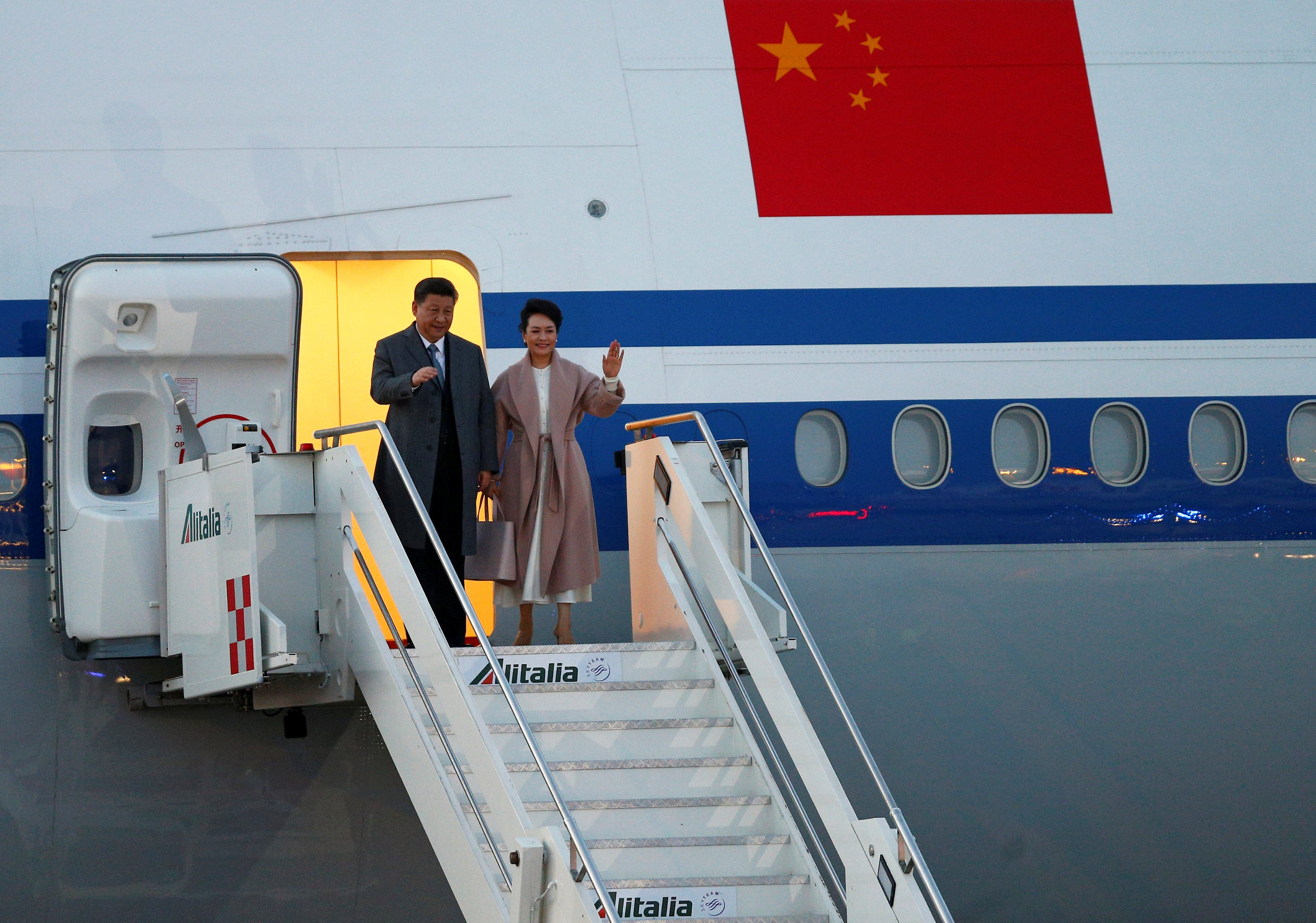 Chủ tịch Trung Quốc Tập Cận Bình và phu nhân Bành Lệ Viện đến sân bay Fiumicino trước chuyến thăm Rome, Italy ngày 21/3/2019. (Ảnh: Reuters/ Yara Nardi)