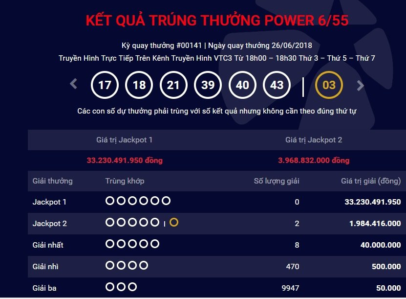 Kết quả kỳ quay 141 của Power 6/55 diễn ra vào ngày 26/6 ghi nhận 2 tấm vé trúng giải Jackpot 2 trị giá 4 tỷ đồng. Theo đó, dãy số may mắn trúng độc đắc là 17 – 18 – 21 – 39 – 40 – 43 và số may mắn là 03.