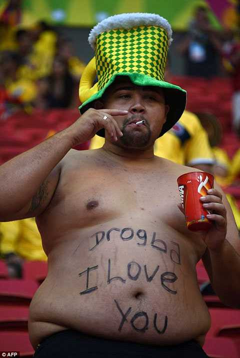 22h19: Các CĐV của Bờ Biển Ngà tiếp tục trung thành với cứu tinh Drogba. Một người đàn ông thậm chí đã viêt tên của Voi rừng lên bụng của mình.