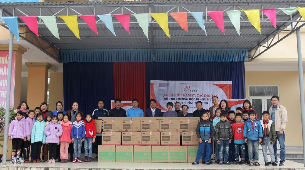 Tiếp đó, ngày 12-13/1 đoàn đã hỗ trợ cho 4 trường tiểu học và mẫu giáo tại huyện Thạch Hà, tỉnh Hà Tĩnh, nơi bị ngập sâu trong đợt lũ vừa rồi. Các mặt hàng hỗ trợ tập trung vào trang thiết bị dạy học như máy vi tính, tivi, máy chiếu, tủ quần áo, dụng cụ thể thao...