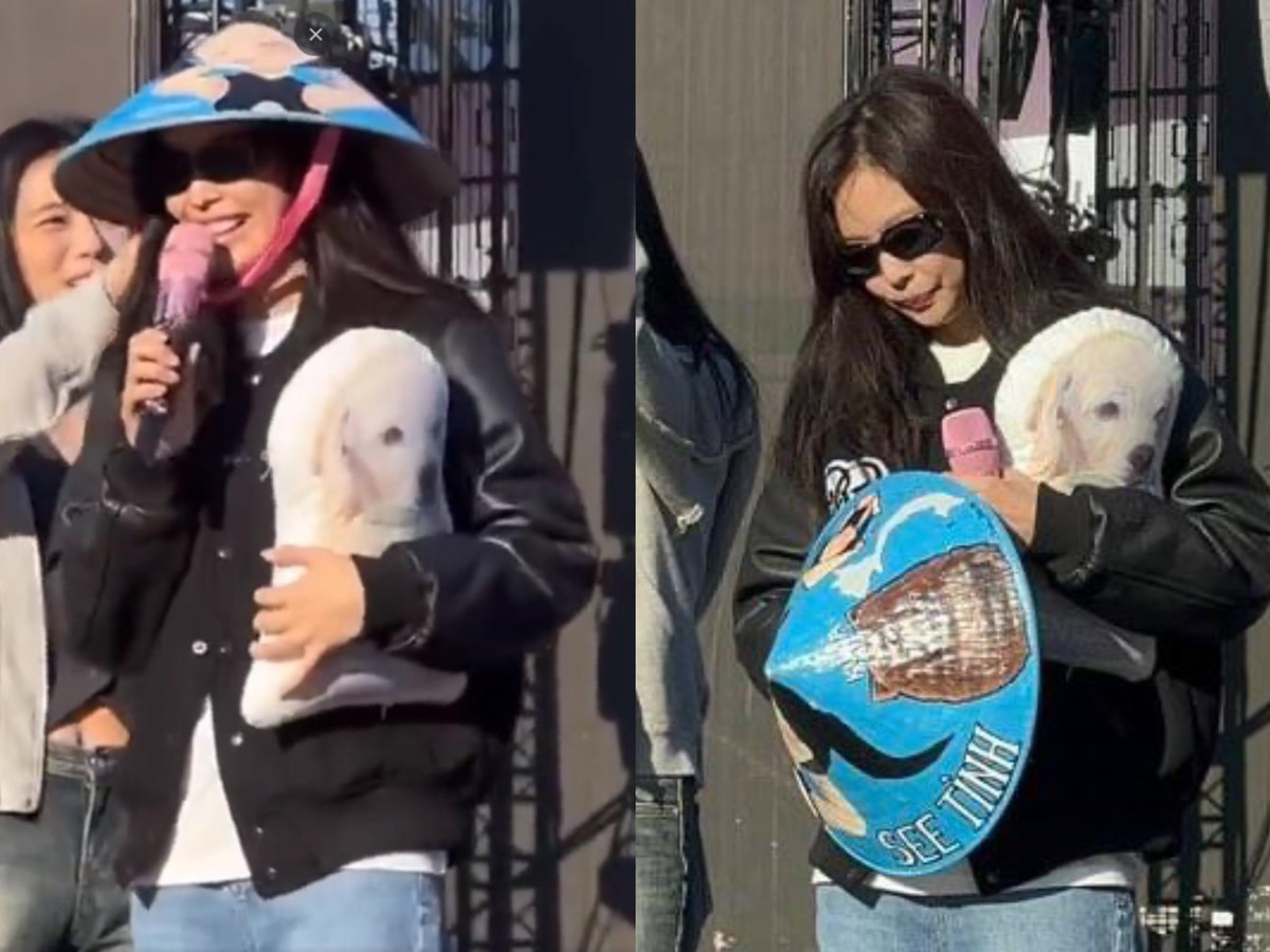 Mặt ngoài của nón lá vẽ hình ảnh Jennie, chú cún cưng và chữ See tình. Chiếc nón sau đó trở thành phụ kiện cho nữ thần tượng trong buổi tổng duyệt.