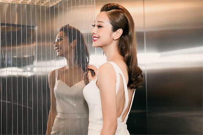 Cô diện trang phục dạ hội trắng hở lưng và xẻ cao.