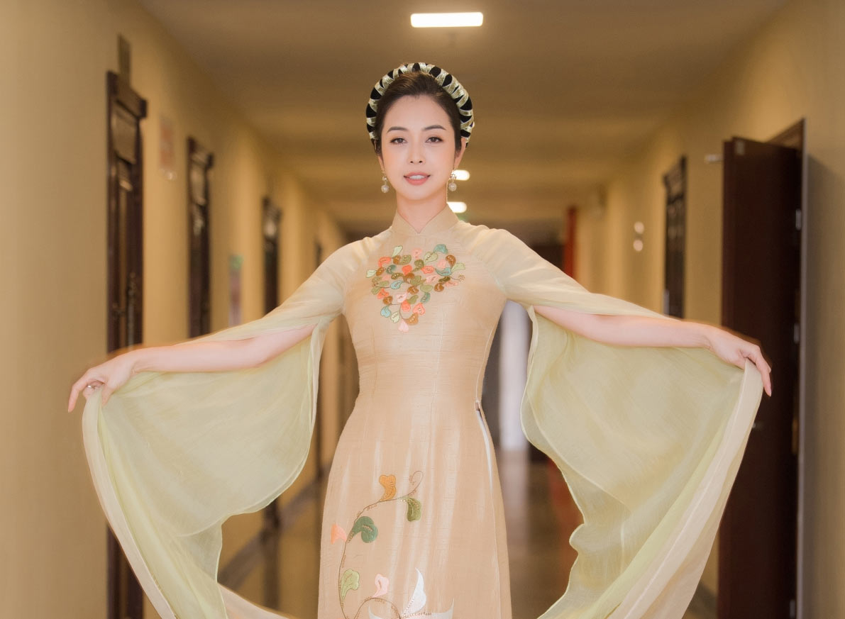 Đặc biệt, thiết kế cách tân tại tay áo với phần voan mỏng càng tăng nét duyên dáng của người mặc, phụ kiện mấn cài tóc đi kèm làm điểm nhấn cho phong cách thuần Việt của người mặc.