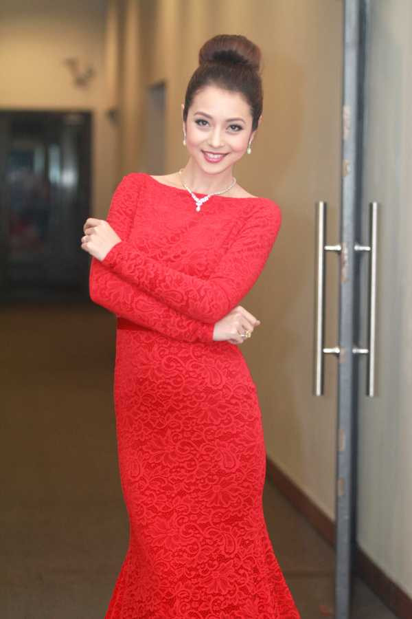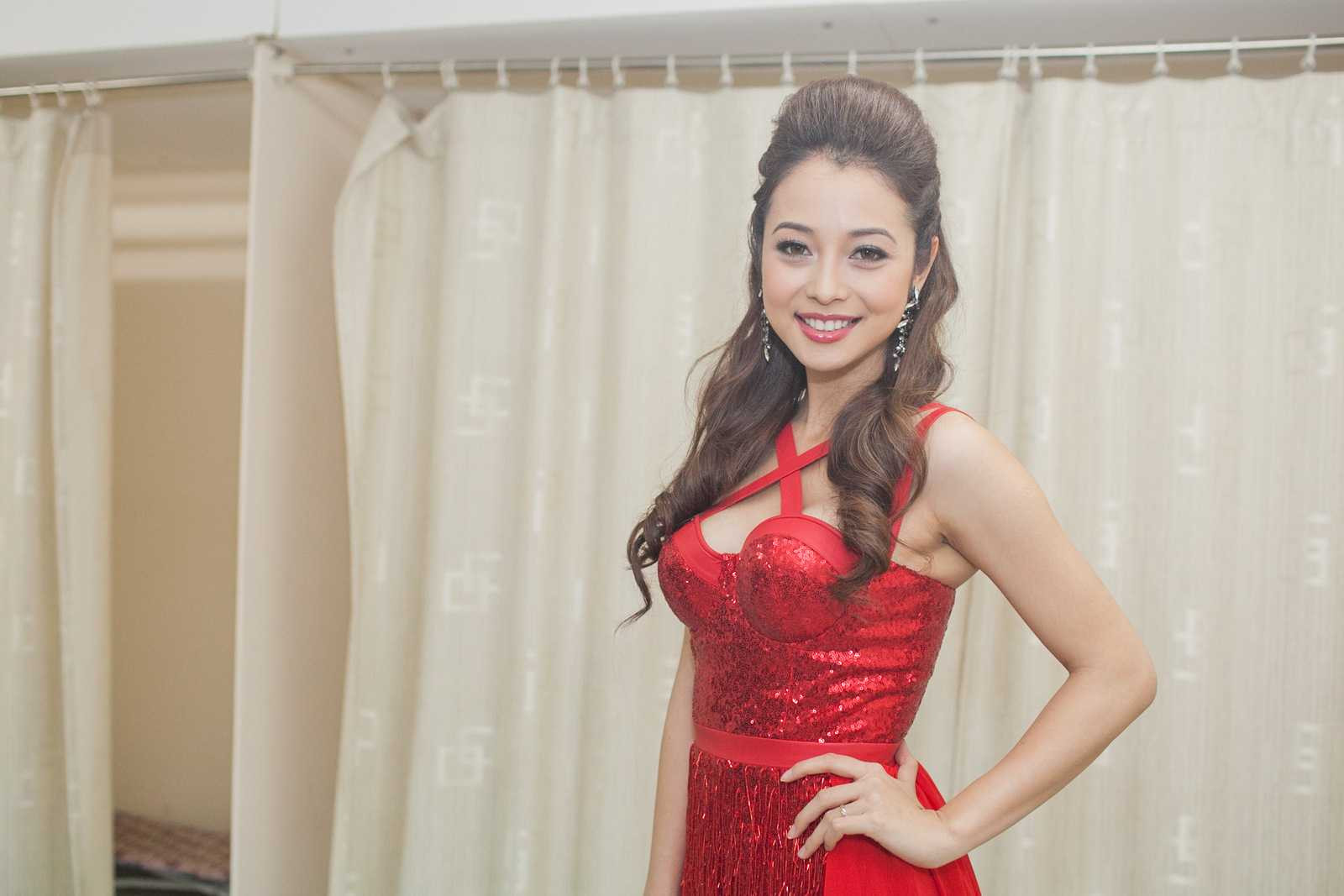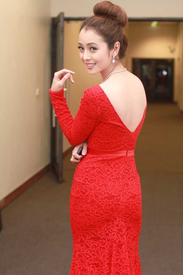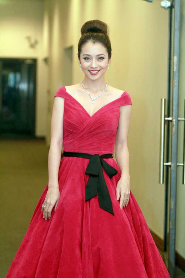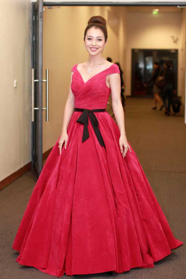 Vẫn là màu đỏ, nhưng Jennifer Phạm chọn một thiết kế cổ điển, kín đáo hơn, tuy nhiên vẫn khoe trọn được vẻ đẹp từ vòng 1 đầy đặn.