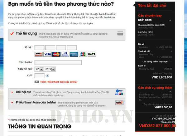 Hành khách hết hồn khi hệ thống thanh toán tiền vé trực tuyến của Jetstar nhảy lên con số 352 triệu đồng cho chuyến bay Sài Gòn - Hải Phòng.