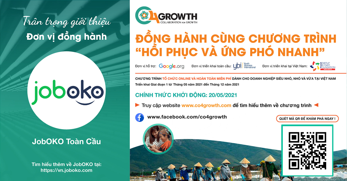 Nằm trong khuôn khổ chương trình “Hồi phục và ứng phó nhanh", dự án CO4GROWTH được phát triển bởi Quỹ Khởi nghiệp Doanh nghiệp Khoa học và Công nghệ Việt Nam (SVF), hỗ trợ bởi Google, Youth Business International (YBI) và các đối tác đồng hành. JobOKO tham gia hỗ trợ dự án ở mảng Nhân sự, Tuyển dụng, với mục đích phát triển và cung cấp các gói hỗ trợ dành cho doanh nghiệp ứng phó với khó khăn trong đại dịch COVID-19.