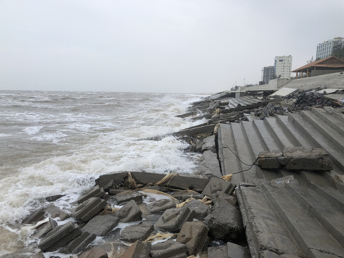 Tại hiện trường, kè bị sóng đánh sập nhiều mảng bêtông, lộ rõ các dầm cốt thép và thổi bay đá hộc.