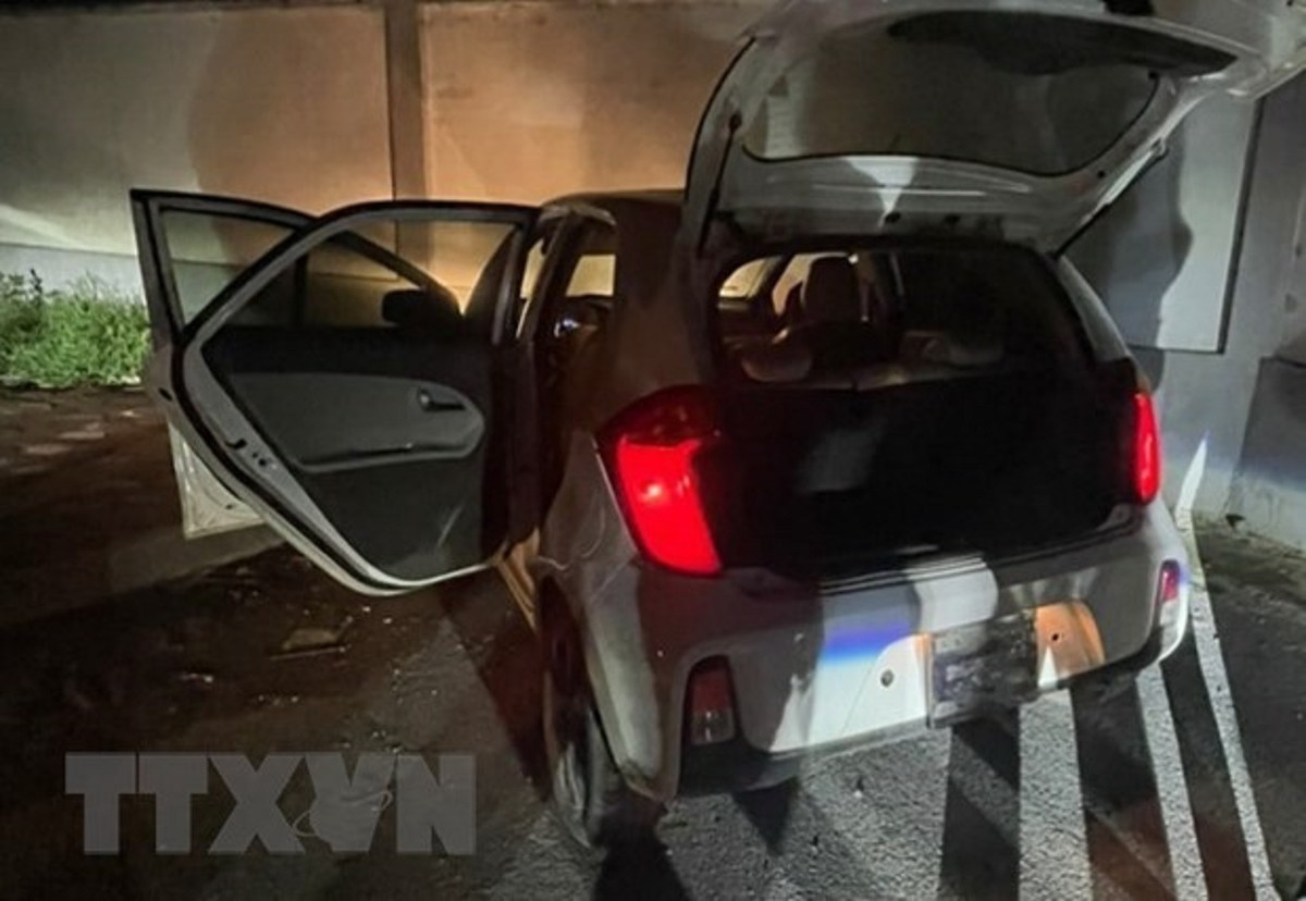 Đối tượng đeo khẩu trang đi trên xe ôtô Kia Morning bước xuống, áp sát, rồi bất ngờ bế cháu bé vào xe, sau đó tẩu thoát. (Ảnh: TTXVN phát)