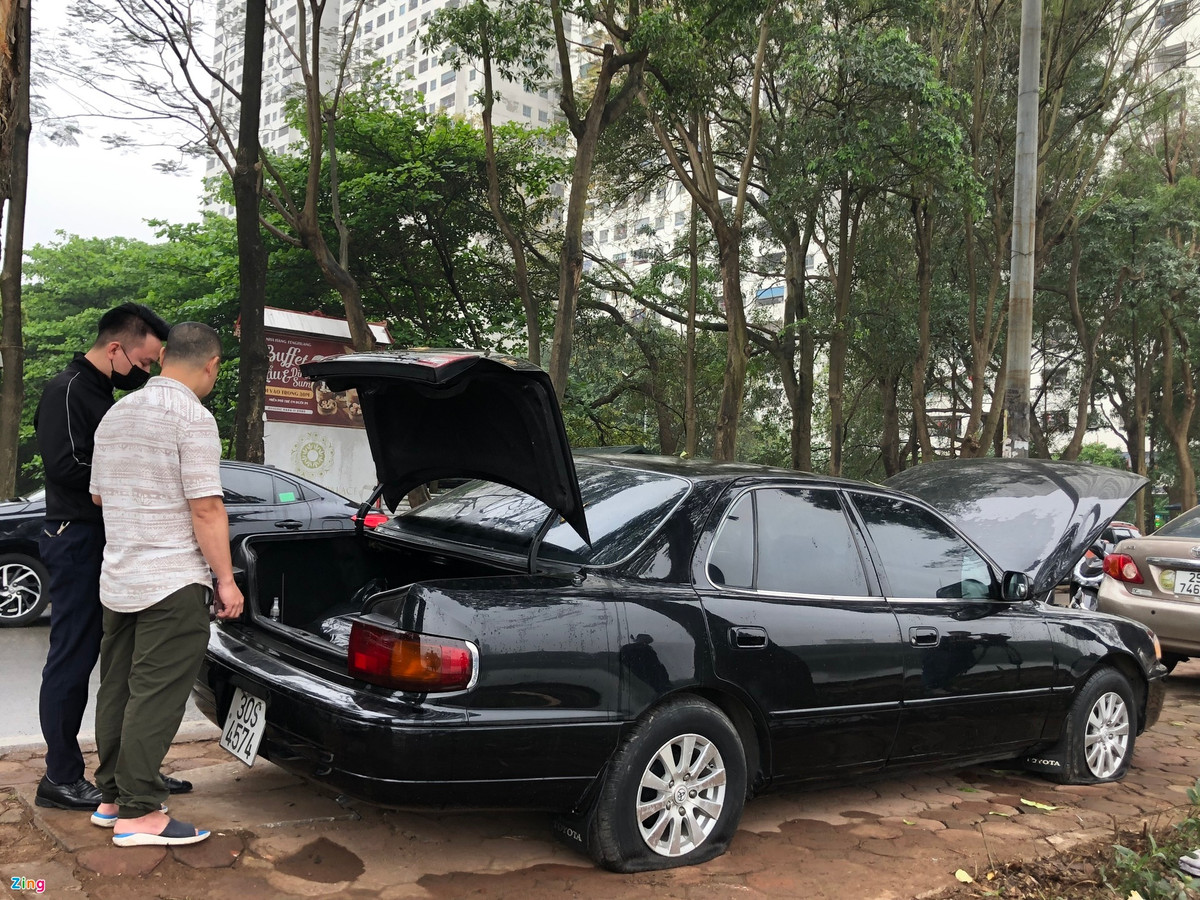 Nhiều ô tô đỗ trên đường ở hồ Linh Đàm bị Toàn rạch lốp.