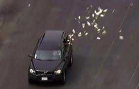 (VTC News) - Chiếc xe chở những kẻ tình nghi cướp một ngân hàng ở bang California ném tiền qua cửa sổ xe để chặn đường truy đuổi cảnh sát trên quãng đường từ Santa Clarita đến Los Angeles sáng sớm hôm 13/9.