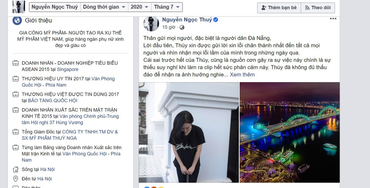 Bà Thúy đăng status xin lỗi người dân Đà Nẵng và cộng đồng mạng.