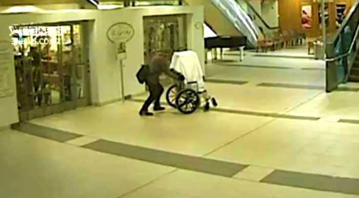 Ra đến bên ngoài không bị phát hiện, kẻ trộm đưa xe lăn vào khu vực vắng người để mở hòm từ thiện lấy tiền ra. Sau đó, nhân viên bảo vệ nhanh chóng phát hiện thấy hộp đã mất tích và đi tìm.
