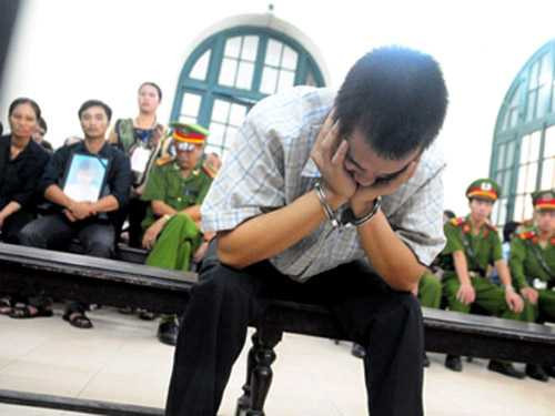| Đặng Trần Hoài tại phiên sơ thẩm. Phía sau là di ảnh nạn nhân và cha mẹ nạn nhân |