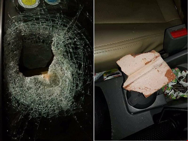 Chiếc ô tô chở cả gia đình anh Trần Trung Ngọc di chuyển trên cao tốc Hà Nội - Thái Nguyên bị kẻ lạ ném đá. (Ảnh: Beat)
