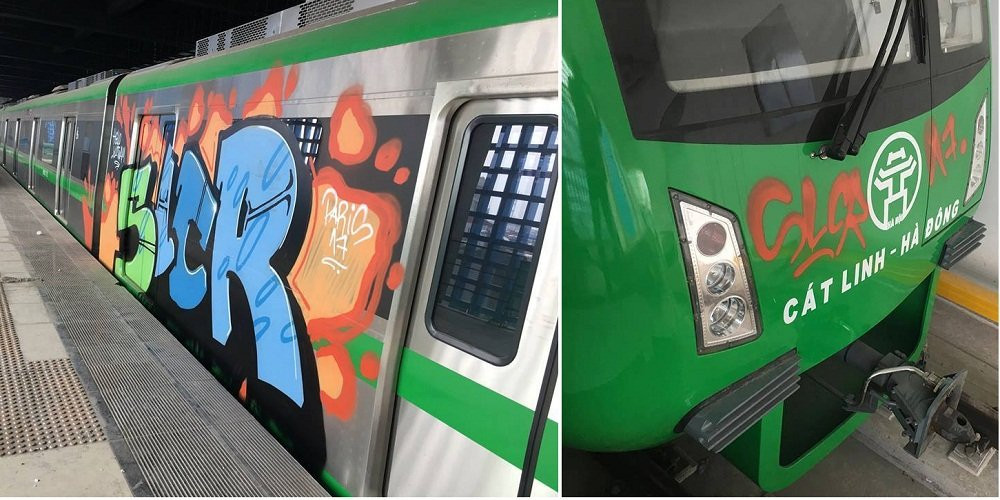 Những hình ảnh này được ghi lại vào ngày 26/12, ở ga Cát Linh (Hà Nội). Theo đó, những hình vẽ này được vẽ bằng sơn với nhiều màu sắc sặc sỡ, kích cỡ rất lớn khiến cho toa tàu bị mất đi những nét thiết kế đặc trưng trước đó.