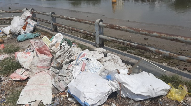 Những bao tải rác người dân để lại trên bờ Kênh Tẻ khi dời đi.