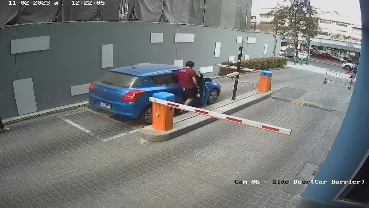Một chiếc ô tô tại Bangkok, Thái Lan bị kẹt chân ga khiến xe lao nhanh về phía trước trong khi tài xế đứng bên thành xe cố gắng đạp phanh.