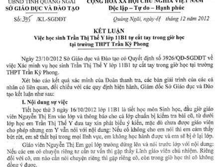 Ngày 11/12, Sở GD-ĐT tỉnh Quảng Ngãi đã ký văn bản số 395 về kết luận vụ việc học sinh cắt tay phản đối cách dạy của cô giáo.