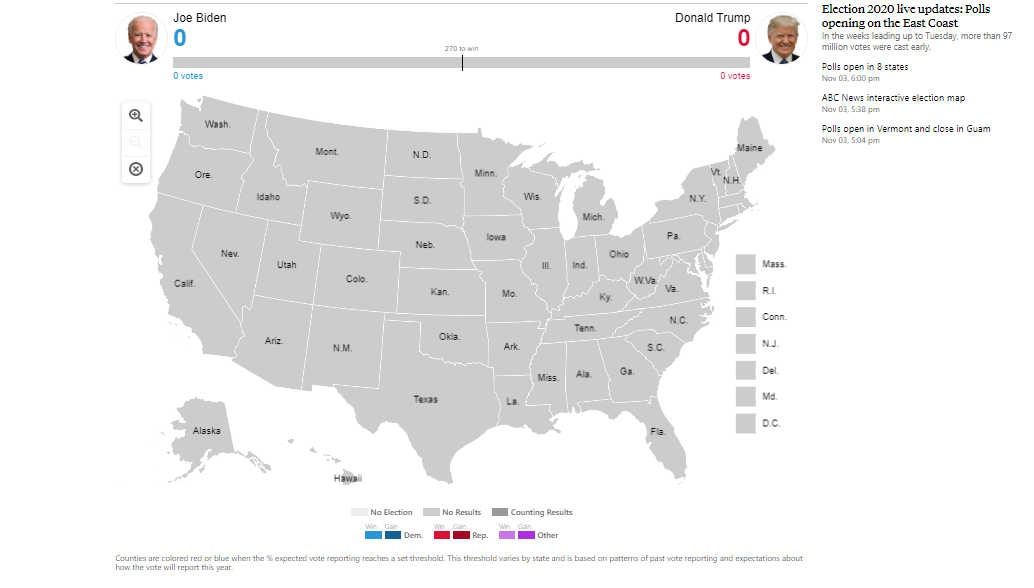 Đến nay, 8 bang trên nước Mỹ mở cửa các điểm bỏ phiếu. Các điểm bỏ phiếu đang mở ở 8 bang gồm Virginia, New York, New Jersey, Maine, Kentucky, Connecticut, Indiana và New Hampshire.