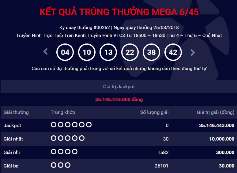 Tuy vậy, nối tiếp kỳ quay lần trước, kỳ này, phía công ty ghi nhận có 30 giải nhất trị giá 10 triệu đồng, 1.582 giải nhì trị giá 300 nghìn đồng và 26.101 giải ba trị giá 30 nghìn đồng. Trước đó, vào ngày quay thưởng 23/3 của loại hình này, với dãy số may mắn là 03 - 06 – 12 – 22 - 26 – 35, giải thưởng Jackpot cũng không tìm ra chủ nhân.