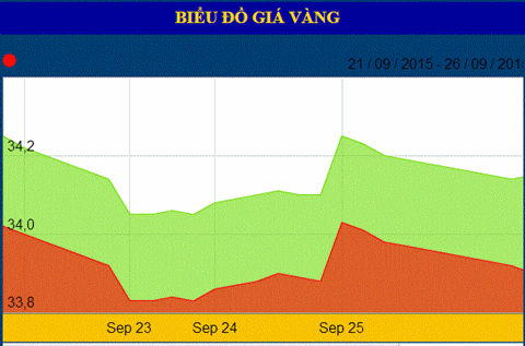 Chốt phiên giao dịch cuối tuần 26/9, giá vàng SJC trên thị trường TP HCM được niêm yết tại Công ty VBĐQ Sài Gòn là 33,90 triệu đồng/lượng chiều mua vào và 34,15 triệu đồng/lượng chiều bán ra.