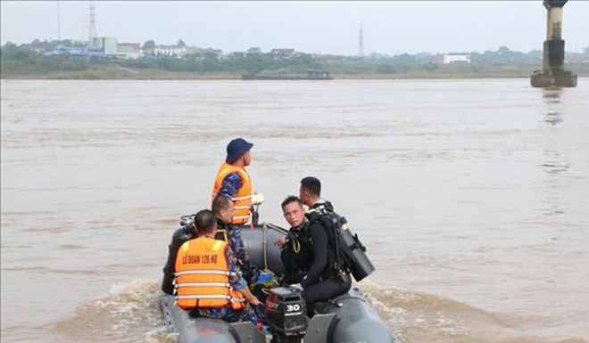 Lực lượng đặc công “người nhái” tìm kiếm người mất tích trên sông Hồng, ngày 1/10/2024. (Ảnh: Tạ Toàn/TTXVN)