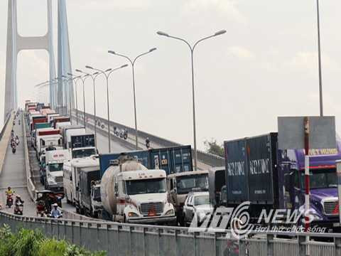 | Cầu Phú Mỹ đang oằn mình gánh chịu những đoàn xe tải nặng |