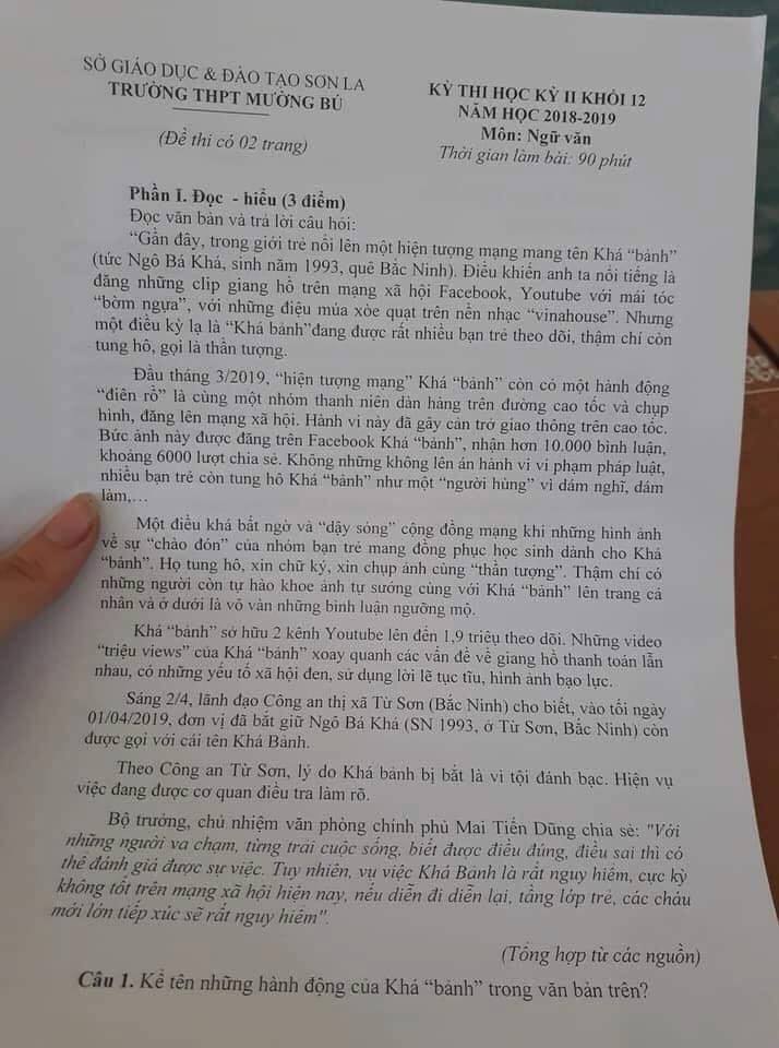 Theo đó, ngữ liệu phần Đọc hiểu là một văn bản tổng hợp từ nhiều nguồn nói về hiện tượng mạng đình đám Khá “Bảnh”. Từ việc anh ta ăn mặc diêm dúa cho đến những hành động điên rồ như dàn hàng ngang trên cao tốc để chụp ảnh đăng Facebook. Thế nhưng, giới trẻ lại ngưỡng mộ Khá “Bảnh” và xem như thần tượng. Mới đây, Khá “Bảnh” bị công an thị xã Từ Sơn (tỉnh Bắc Ninh) bắt vì tội đánh bạc.