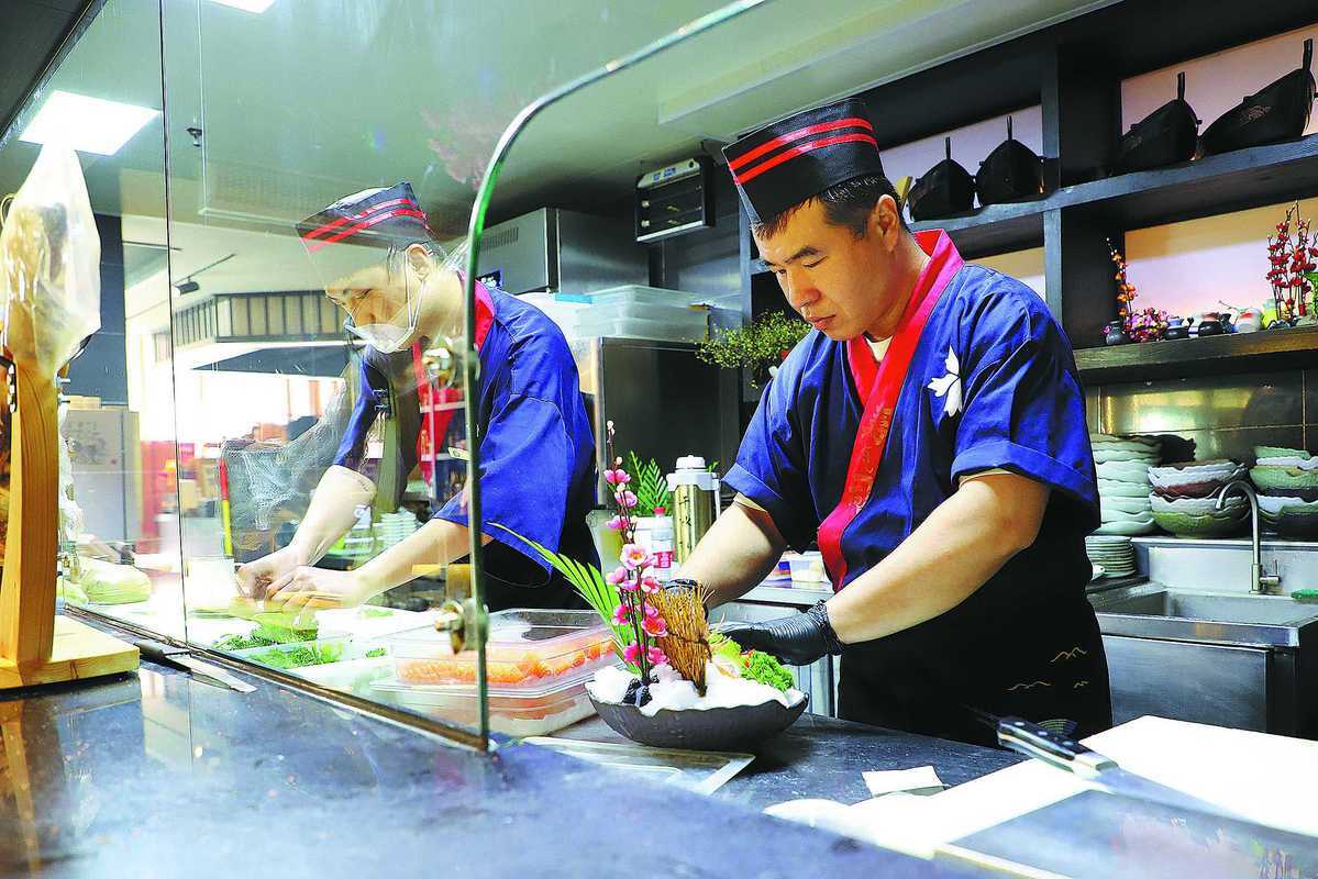 Đầu bếp tại một nhà hàng Nhật Bản ở Trung Quốc đang chuẩn bị đồ ăn cho khách. (Ảnh: China Daily)