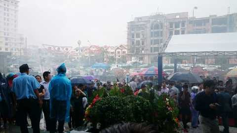 | Nhiều người dân đứng dưới mưa xem lễ khai trương, chờ đến giờ vào mua sắm. |