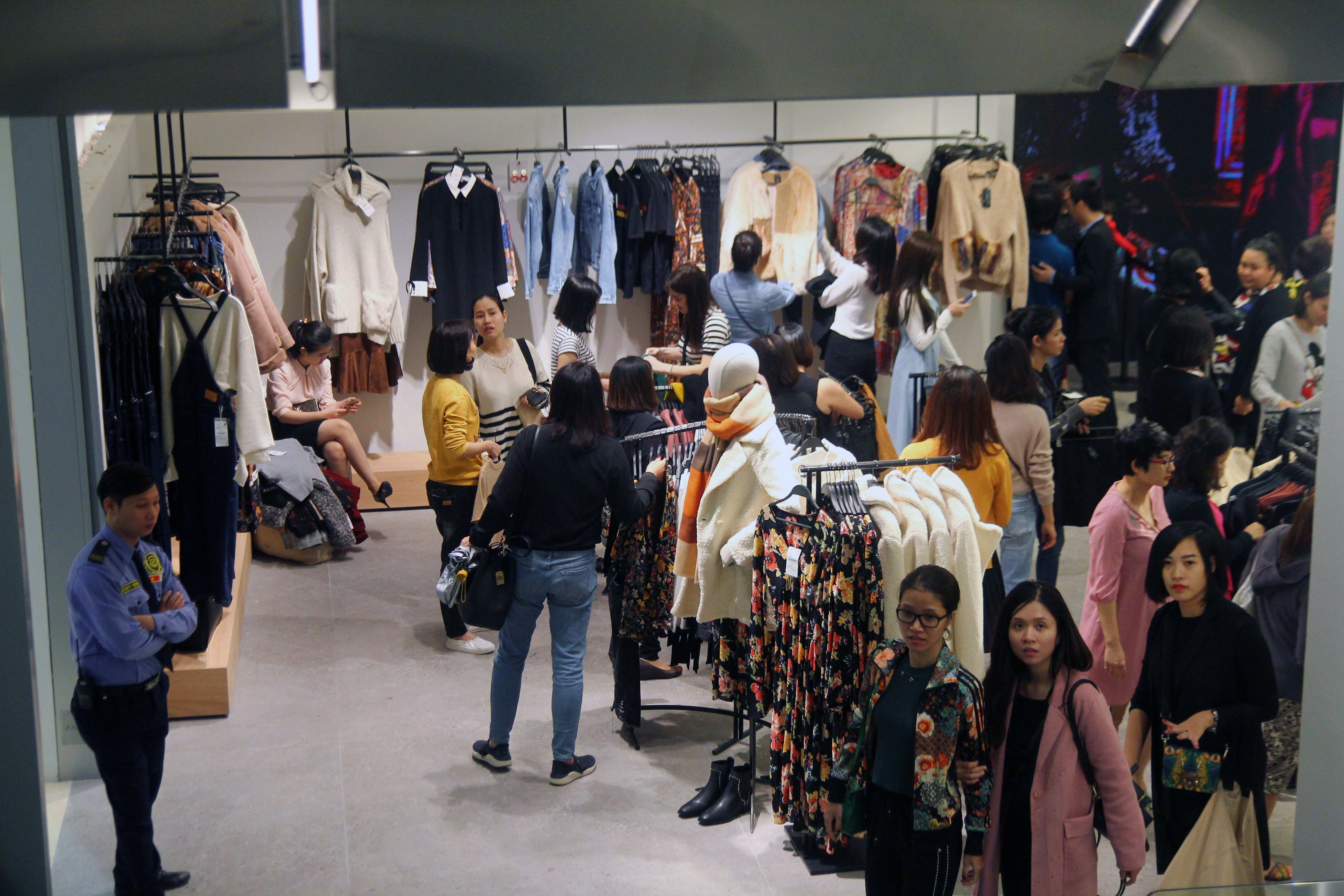 Lượng khách đến cửa hàng Zara Hà Nội trong ngày khai trương chính thức rất đông. Phía cửa hàng cũng đã sắp xếp nhân viên đứng thức trực ở nhiều điểm để thu dọn đồ đạc, song không ăn thua.