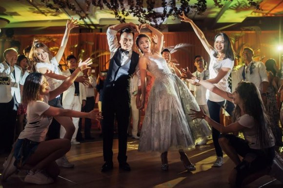 Tiệc cưới ở Đài Loan có sự tham gia của hơn 400 khách mời, trong đó có không ít nghệ sĩ hạng A. "Tiểu Long Nữ" Trần Nghiên Hy một mình đến dự cưới bạn thân, ông xã Trần Hiểu không đi cùng do bận rộn tại Đại lục quay phim Độc cô hoàng hậu.