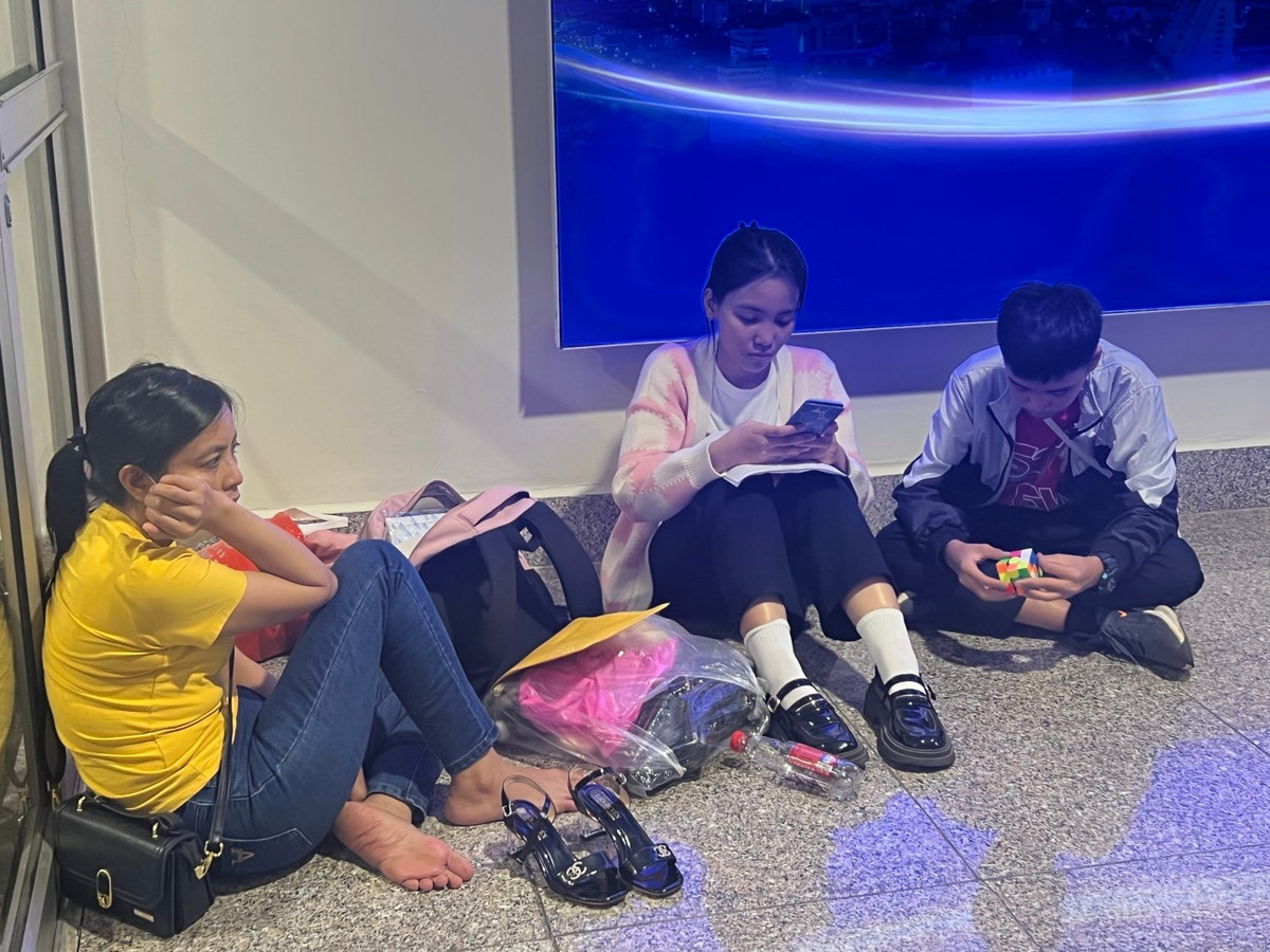 Một số gia đình có người già, trẻ nhỏ mệt mỏi khi phải chờ đợi nhiều tiếng đồng hồ để lên máy bay.