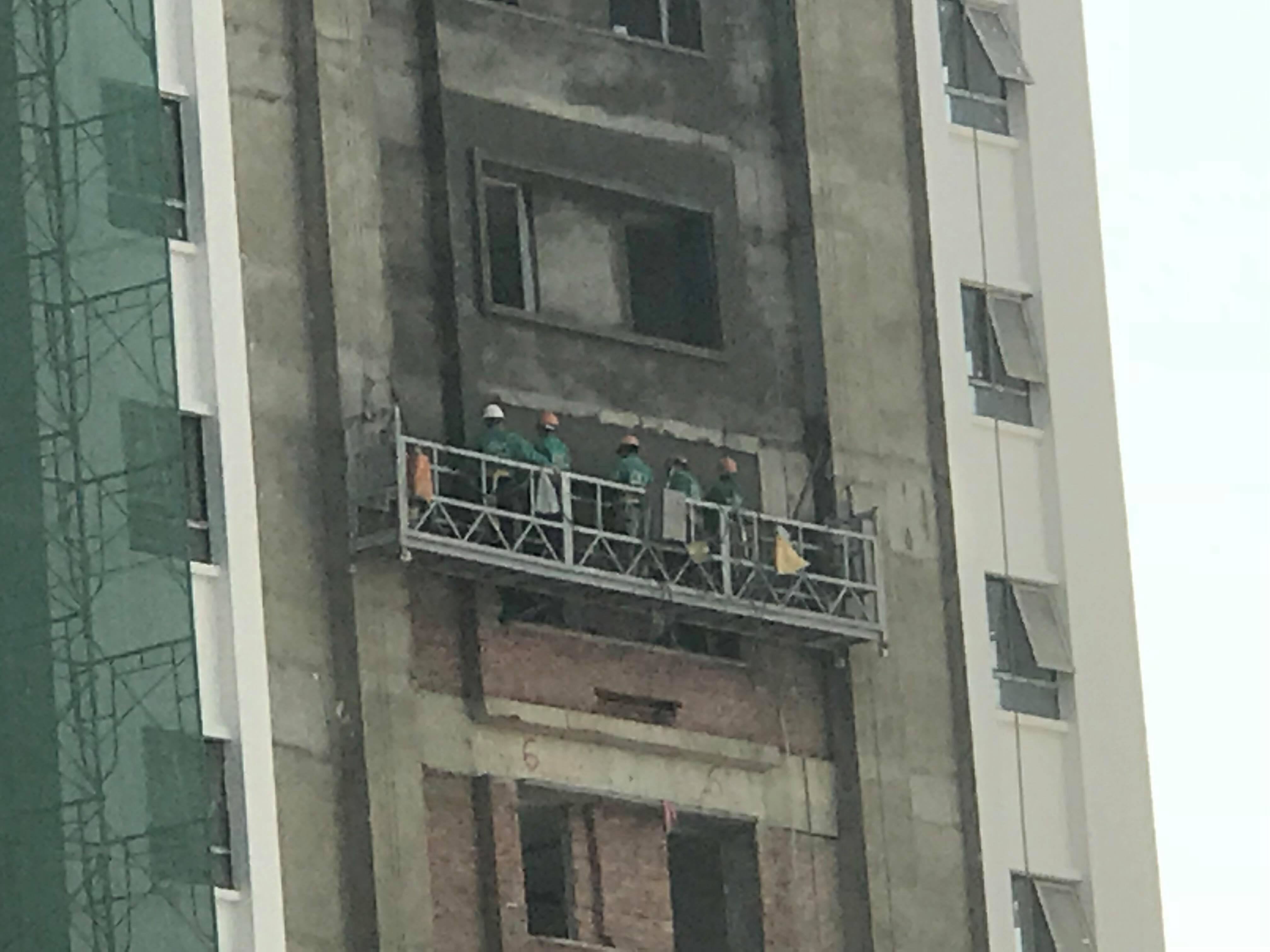 Bên ngoài tòa nhà, các công nhân vẫn đang "đu dây" để sơn tường và trát vữa tại mảng tường phía sau khách sạn.
