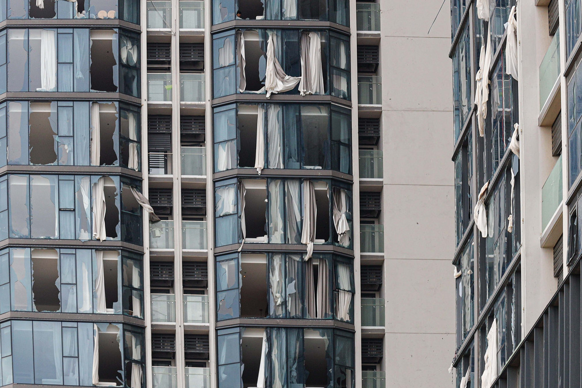 Mặt hướng ra biển của toà nhà bị tàn phá nặng nề nhất. Hầu hết các tấm kính đều vỡ toang, trơ ra những tấm rèm cửa trong gió.