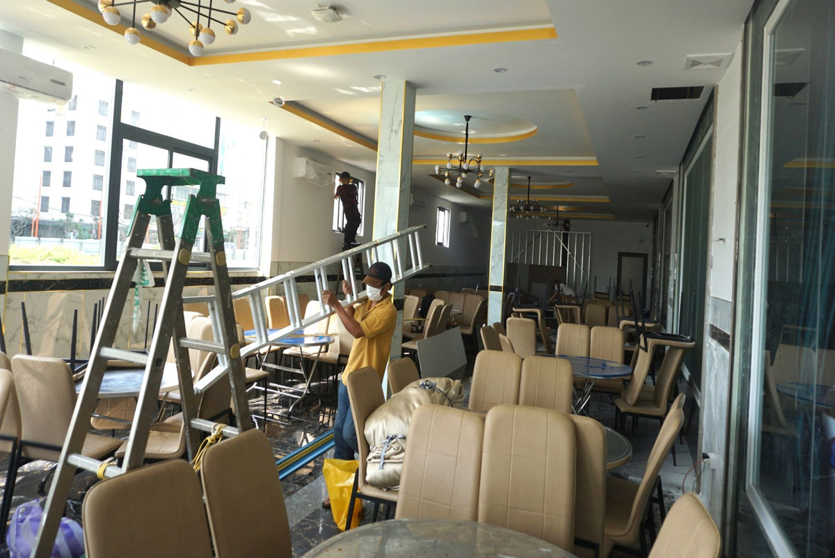 Cơ sở vật chất, bàn ghế chất đống 3 năm qua phủ bụi, hư hỏng đang được các nhà hàng huy động nhân lực sửa chữa.