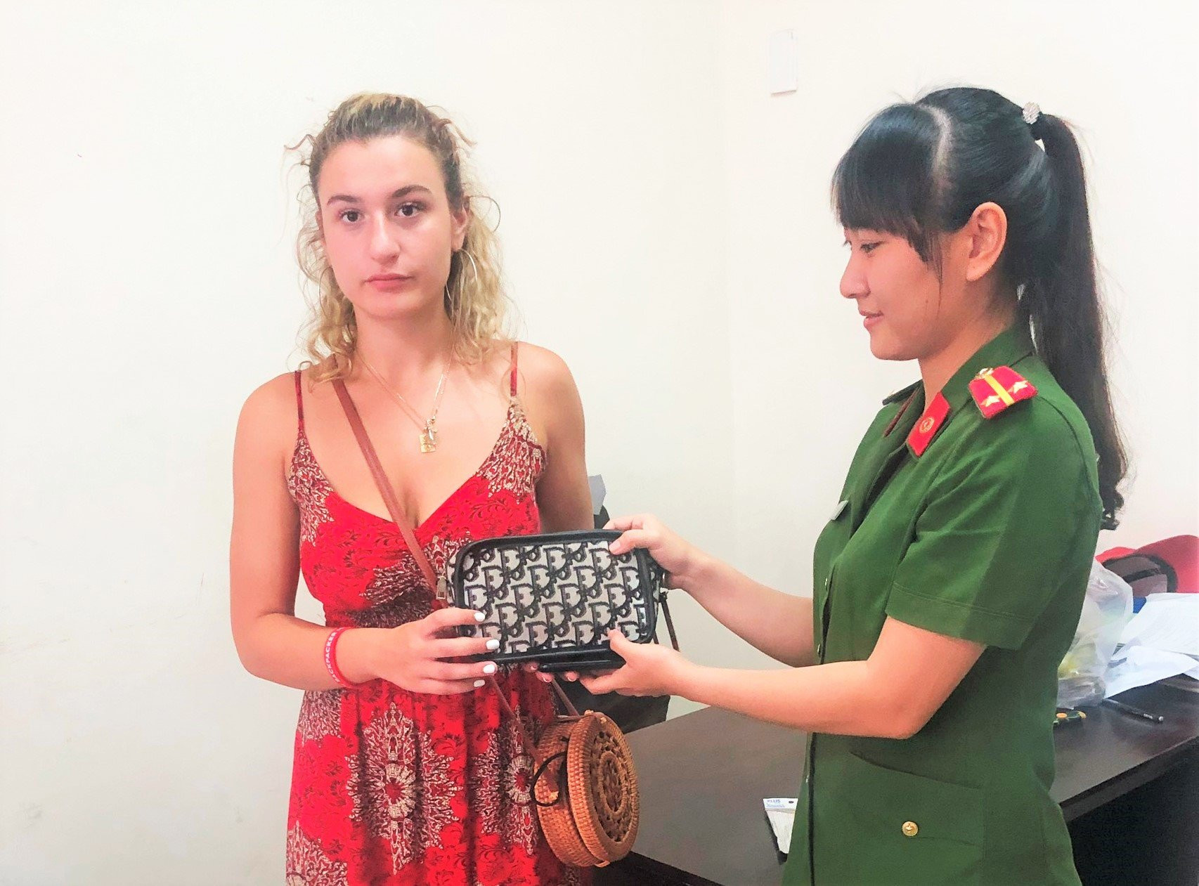 Nữ du khách nhận lại tài sản bị cướp. (Ảnh: C.A)