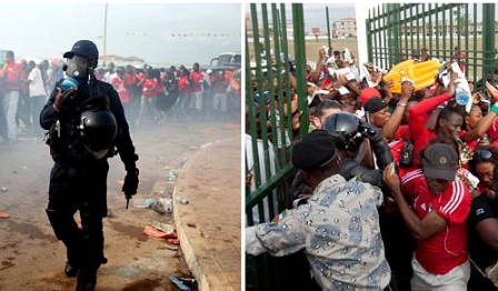 | Lực lượng cơ động phải sử dụng hơi cay để tái lập trật tự bên ngoài sân Bata (37.500 chỗ ngồi). |