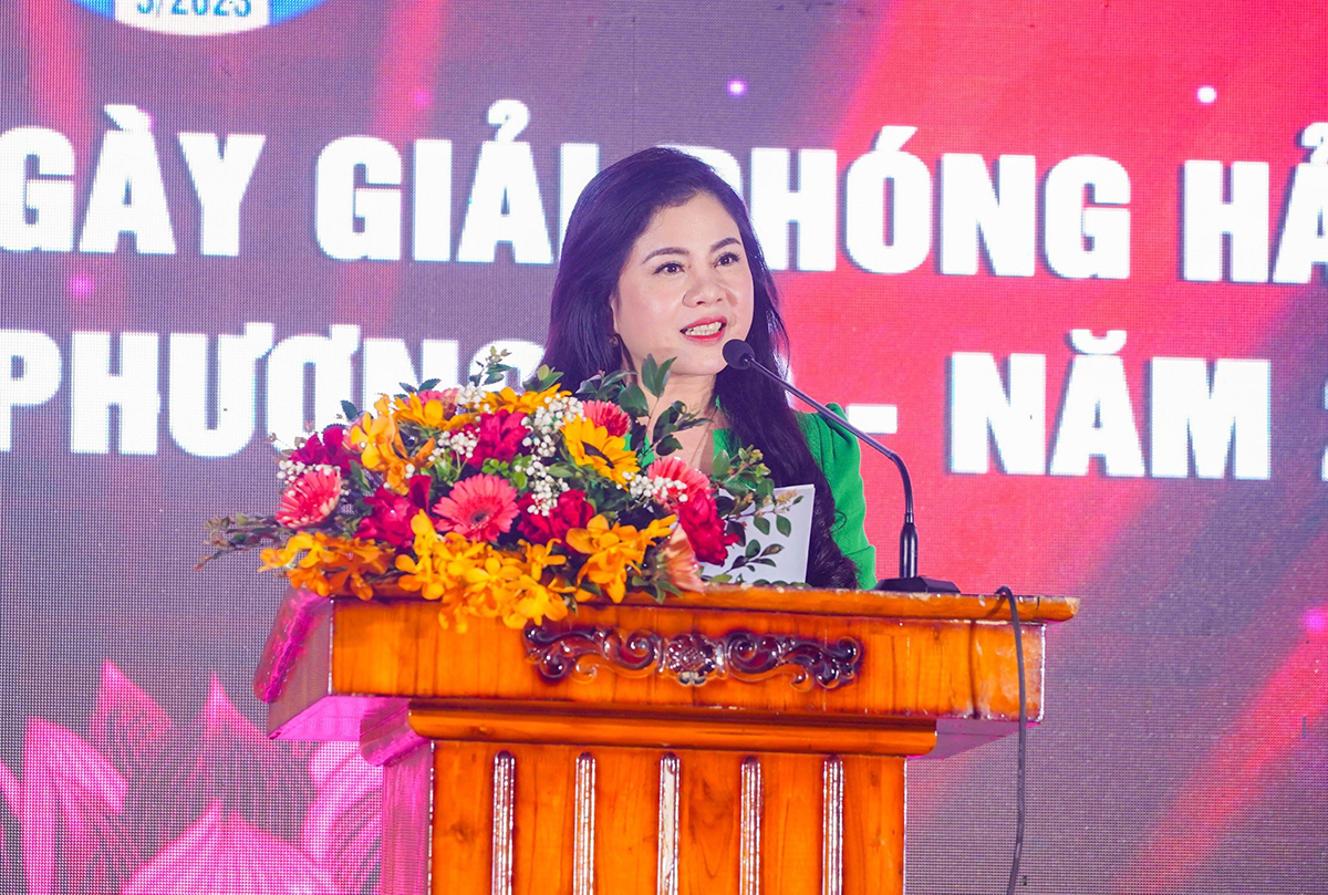 Bà Trần Thị Hoàng Mai – Giám đốc Sở Văn hóa và Thể thao Hải Phòng phát biểu khai mạc liên hoan. (Ảnh: Cổng thông tin điện tử TP Hải Phòng).