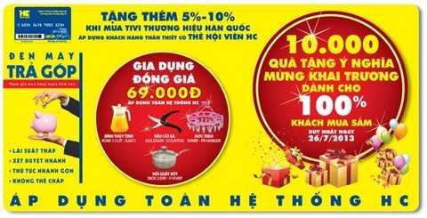 Chương trình “10 Ngày Vàng Khai trương”,ưu đãi dành riêng cho thành viên mới HC Hải Dương: Tặng ấm siêu tốc 1,8 lít trị giá 200.000 đồng cho đơn hàngtrên 2 triệu đồng; Tặng phích đun nước điện tử thương hiệu Nhật Bản 600.000 đồng cho đơn hàng trên 5 triệu đồng, áp dụng trong 5 ngày 26 đến 30/7/2013; Tặng nồi cơm điện chống xước 290,000 đồng cho đơn hàng trên 5 triệu đồng, áp dụng trong 5 ngày 31/7 đến 4/8/2013.