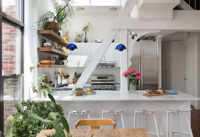 Bàn bếp hình chữ U chạy quanh 3 bức tường, tận dụng được tối đa không gian lưu giữ. Mặt bàn sử dụng đá cẩm thạch trắng, hài hòa với màu sắc chung của phòng bếp. Bên dưới mặt bàn là các cánh tủ bếp, tạo thành không gian lưu trữ rộng rãi. Bồn rửa được đặt ở mặt bàn bếp phía góc tường trong cùng. Ngay phía trên bồn rửa, chủ nhà bố trí 3 chiếc kệ gỗ để đặt bát đĩa và các đồ trang trí nhỏ xinh vô cùng đẹp mắt.