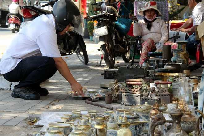 Cận Tết, "chợ" đồ cổ với những vật dụng quen thuộc thời xưa như tiền đồng, chén bát bằng, bình nước, lon gô, bình tông thép, cối giã trầu, bàn ủi con gà... được các tiểu thương bày bán trên vỉa hè đường Nguyễn Ái Quốc, TP Biên Hòa, Đồng Nai.
