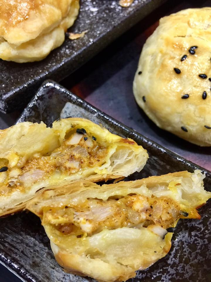 - Lấy bột ra khỏi tủ lạnh, chia thành nhiều miếng bột nhỏ, cán mỏng, đặt nhân gà cà ri vào trong rồi tạo hình bánh theo ý thích và rải lên trên một lớp vừng đen.