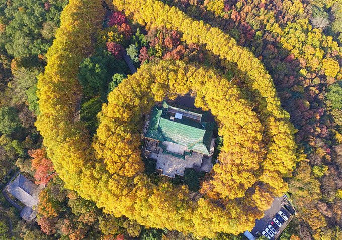 Từ trên cao, cung điện Mỹ Linh do Tưởng Giới Thạch xây dựng giống viên ngọc quý trên sợi dây chuyền tạo từ hàng cây phong đổi màu theo mùa.