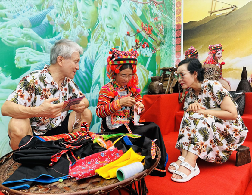 Trang phục truyền thống:Các bộ trang phục đặc trưng như váy thổ cẩm rực rỡ của người H’Mông, áo dài cổ thêu hoa văn tinh xảo của người Lự hay những chiếc khăn piêu mềm mại của người Thái được trưng bày, làm nổi bật sự sáng tạo và tinh tế trong nghệ thuật dệt may thủ công.