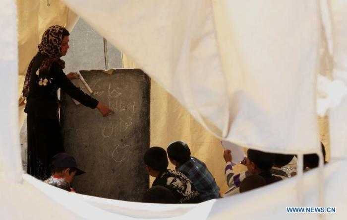 Còn đây là cảnh cô giáo đang giảng bài cho các học trò bên trong một túp lều được lập tạm bợ trong trường.